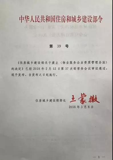 同年12月,住建部印发了《关于做好取消物业服务企业资质核定相关工作的通知》,要求各地落实《国务院关于第三批取消中央指定地方实施行政许可事项的决定》(国发[2017]7号)和《国务院关于取消一批行政许可事项的决定》(国发[2017]46号)。