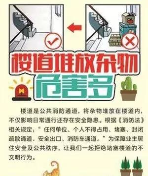 九、在楼外、楼梯间及公共区域内存放杂物、蔬菜、鞋架、电动车、自行车、废弃纸箱子等既违反有关消防安全管理及物业规定,也不便于业主通行,更存在重大消防及物品被盗的安全隐患;为了不影响楼内的公共卫生与安全以及业主的正常通行,请您自觉将楼道内堆积存放的自家杂物即刻清走,否则将视为无主垃圾处理。