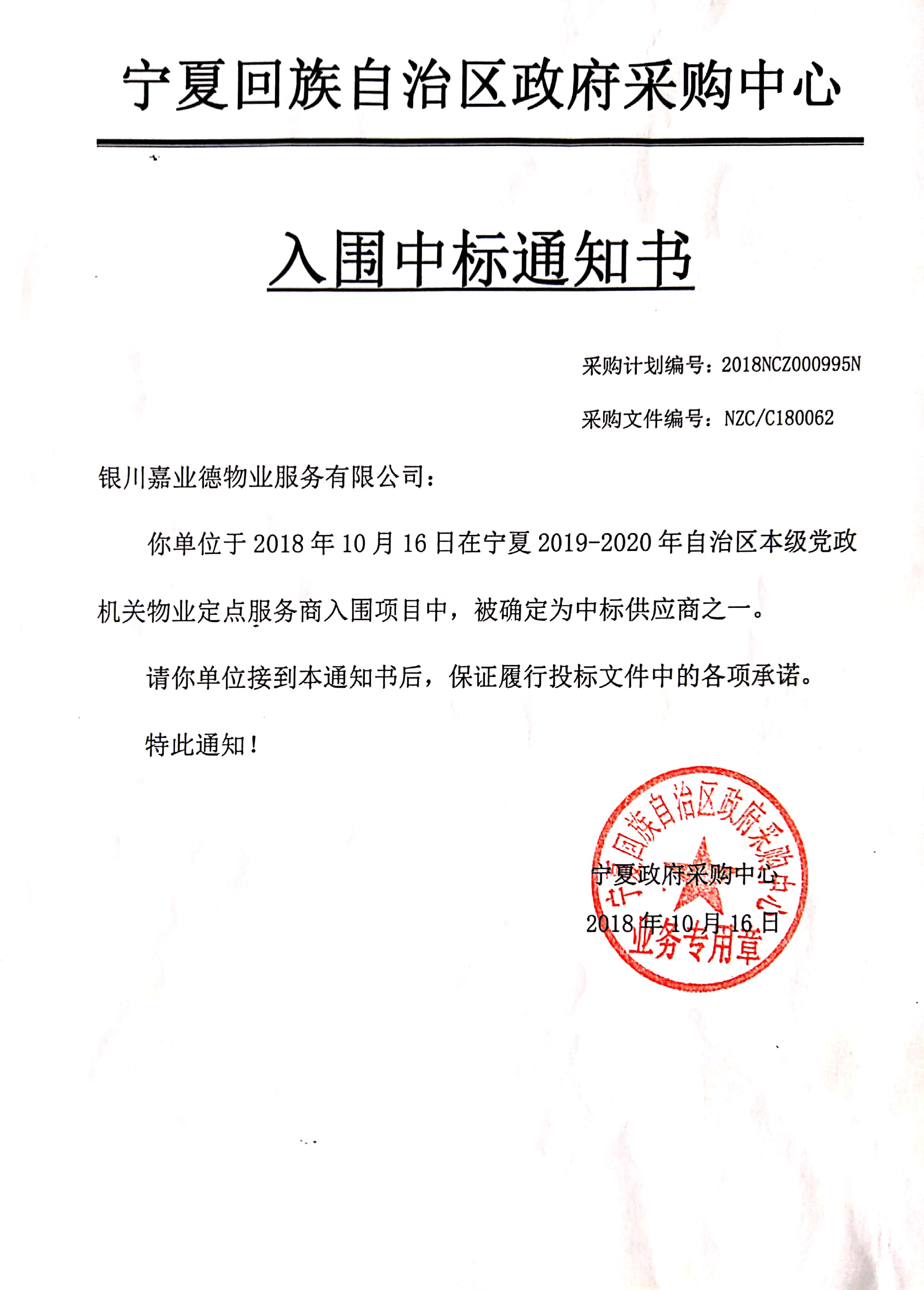 政府采购入围中标通知书